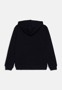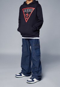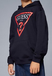 Personne portant un sweat à capuche noir GUESS avec un logo triangle rouge et un point d'interrogation, associée à un jean bleu, debout devant un fond gris.
