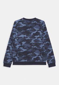 Sweat-shirt camouflage avec un logo triangulaire rouge, fabriqué en tissu doux avec des poignets et un ourlet côtelés, dans des nuances de bleu marine et bleu clair.