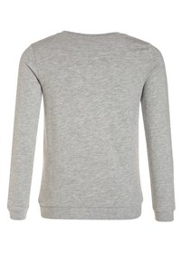 Sweatshirt gris à manches longues, arborant un logo triangle rose étincelant avec "GUESS" et "U.S.A." en texte noir au centre.