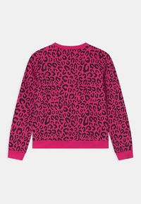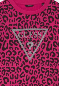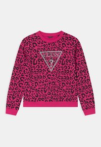 Sweat-shirt à manches longues rose vif avec imprimé léopard noir et logo triangle Guess en paillettes argentées centré sur la poitrine.