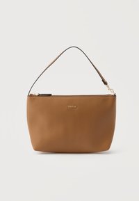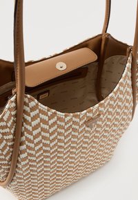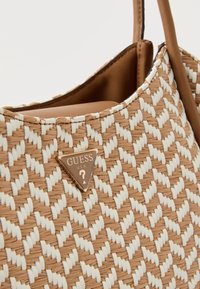 Sac fourre-tout en tissu tissé beige et blanc avec des poignées en cuir beige, accompagné d'une petite pochette en cuir lisse beige avec fermeture éclair et logo Guess.