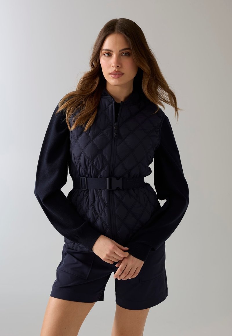 Veste matelassée bleu marine avec col montant, fermeture éclair complète et motif de couture en diagonale ; portée sur un haut noir à manches longues.