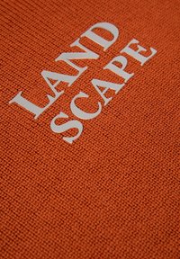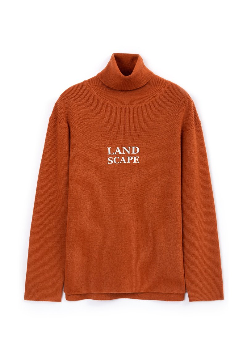 Pull à col roulé orange en matière côtelée, avec un graphique blanc "LAND SCAPE" centré sur le devant. Design simple et coupe décontractée.