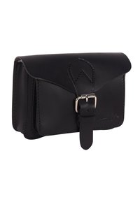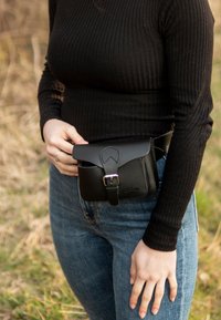 Personne portant un jean bleu, une chemise blanche à boutons avec les manches retroussées, et une ceinture-sacoche en cuir noir avec une boucle autour de la taille.
