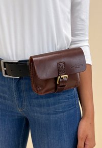 Sac banane en cuir marron avec boucle attachée à une ceinture noire portée sur un jean bleu et un haut blanc à manches longues sur une personne.