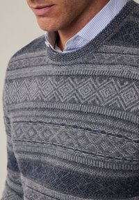 Homme portant un pull en maille à motifs gris superposé à une chemise bleue, associé à un pantalon foncé, se tenant devant un fond clair.