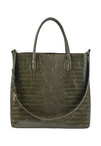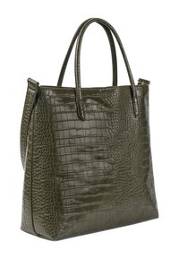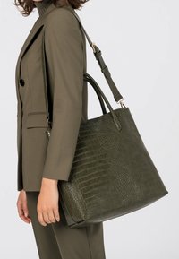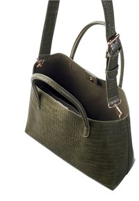 Femme en blazer olive portant un grand sac cabas en cuir vert foncé à motif crocodile avec des anses sur l'épaule.