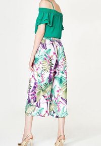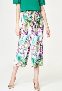 Pantalons larges floraux blancs avec des motifs de feuilles tropicales vertes et violettes. Les pantalons présentent un détail de taille nouée et des poches latérales.