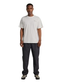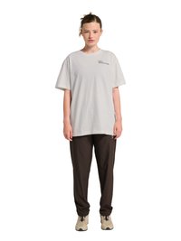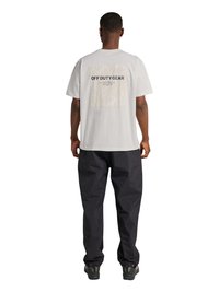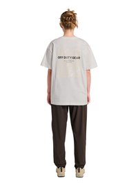 T-shirt en coton blanc avec un graphique carré au dos portant l'inscription "OFF DUTY GEAR", fond beige clair et motif linéaire abstrait.