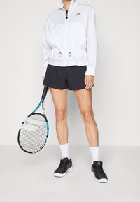 Personne portant une veste blanche à fermeture éclair avec des poignets élastiques et un short noir, debout devant un fond clair uni.