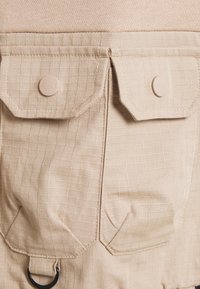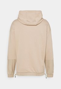 Sweat-shirt à capuche beige avec un panneau inférieur texturé, des poches avant, un ourlet ajustable avec cordon de serrage et un logo brodé sur la poitrine.