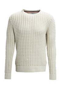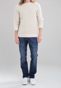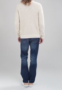 Homme portant un pull en maille blanc et un jean bleu, une main dans la poche, sur un fond uni gris clair.