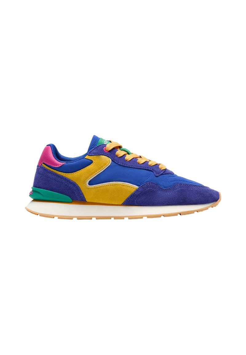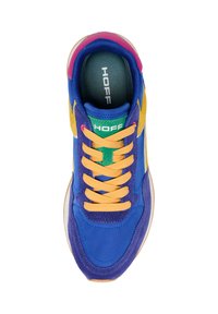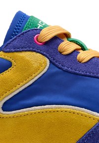Baskets basses avec des panneaux bleus, jaunes, violets, roses et verts, lacets orange et semelle beige, présentées de profil sur fond blanc.