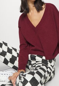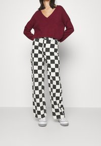 Pull court bordeaux à col en V avec poignets côtelés, associé à un pantalon taille haute à carreaux noir et blanc, présentant un style denim classique.