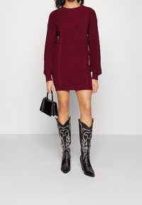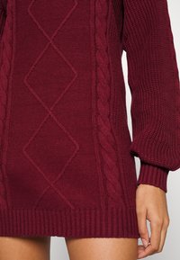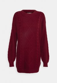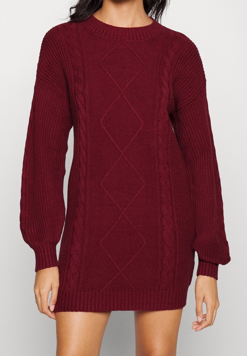 Femme portant une robe pull en maille torsadée bordeaux avec des motifs en losange et des manches ballons, se tenant devant un fond uni.