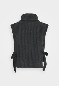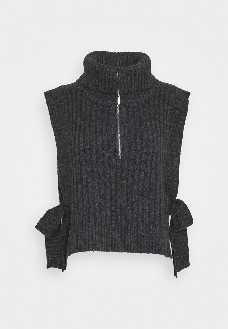 Pull sans manches gris foncé avec un col montant, une texture côtelée, une fermeture éclair frontale et des liens latéraux pour un ajustement réglable.