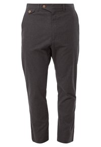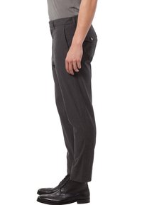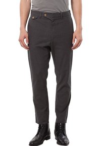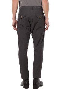 Pantalon pour homme gris foncé à coupe slim, fermeture par bouton à la taille, et deux poches avant visibles avec des boutons.