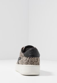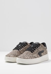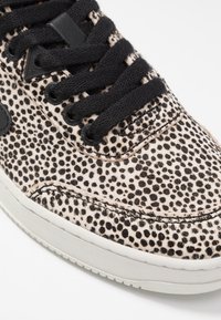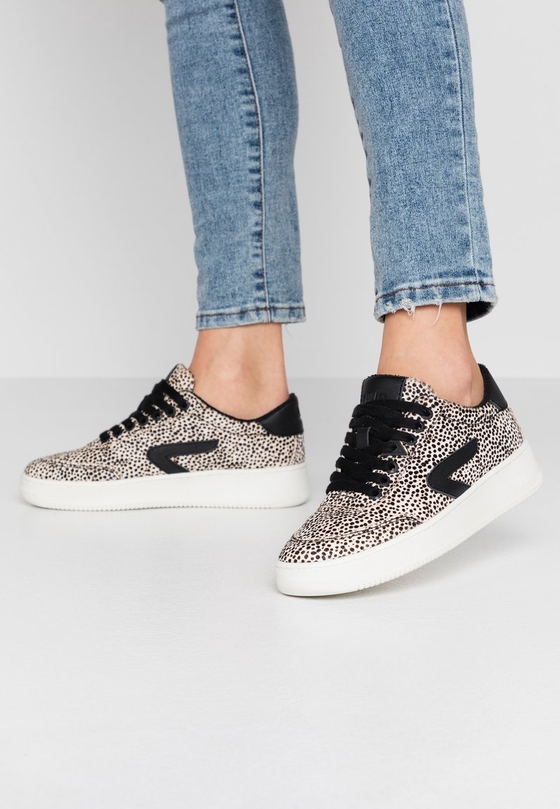 Baskets avec une base beige et un motif de points noirs, lacets noirs et accents au talon. Elles présentent une semelle en caoutchouc blanche et un design à bout arrondi.