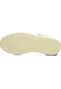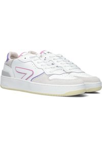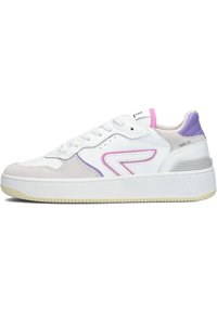 Baskets blanches avec accents violets et roses, en cuir et suède, bout rond, design à lacets et semelle texturée.