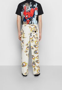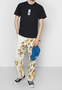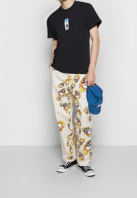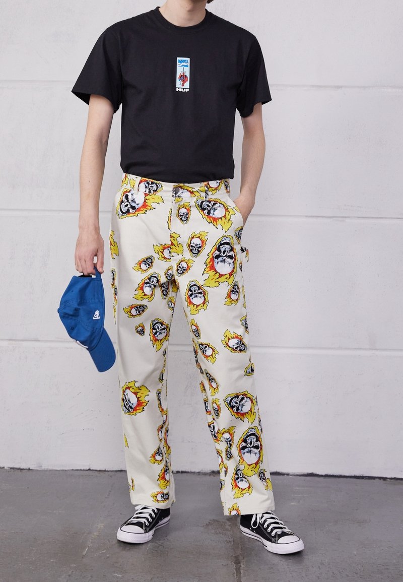 T-shirt noir avec un logo graphique, pantalon blanc à motifs de crânes enflammés, et baskets noires. Casquette de baseball bleue tenue à la main.