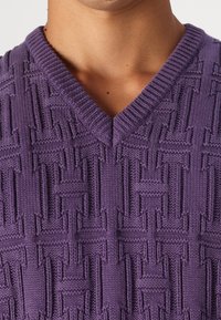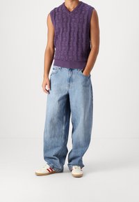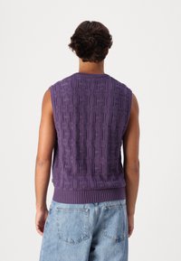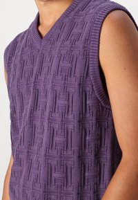 Homme portant un gilet en maille texturée violet sans manches avec col en V, associé à un jean en denim clair, debout devant un fond uni.