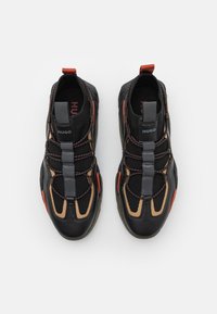 Chaussures de sport noires et orange avec tige texturée, semelle en zigzag et col rembourré. Dotées de lacets et d'un logo placé de manière visible.