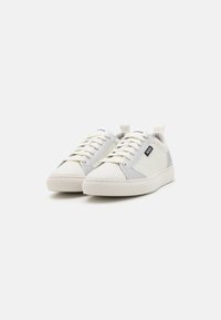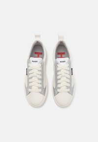 Baskets basses blanches avec des accents argentés, devant à lacets, étiquette noire "HUGO" sur le côté et languette de tirage au talon.
