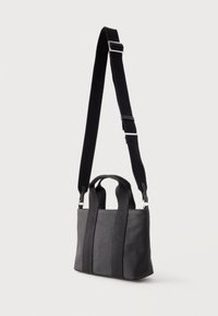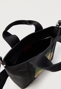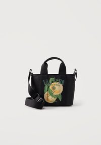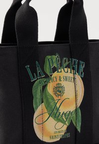 Sac à main en toile noire avec bandoulière détachable et motif imprimé de deux pêches ainsi qu’un texte en français sur le devant.