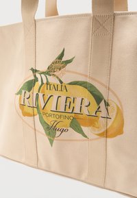 Sac fourre-tout en toile beige avec deux poignées, présentant un motif de branche de citron et le texte « Italia Riviera Portofino Hugo » sur le devant.