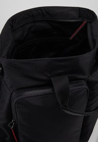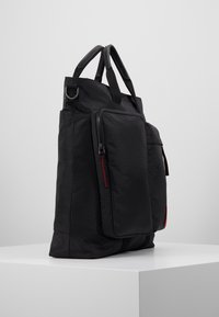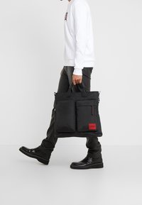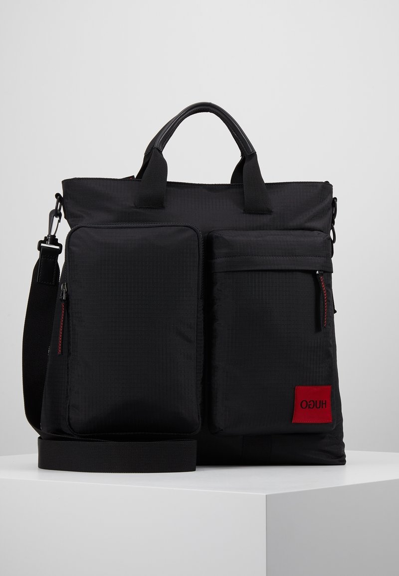 Sac à épaule rectangulaire noir avec deux poches zippées à l'avant, des poignées supérieures, une bandoulière ajustable et un patch logo Hugo rouge sur la poche inférieure droite.