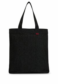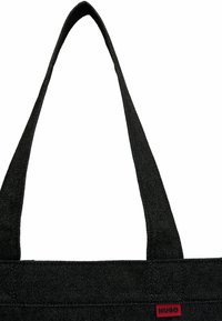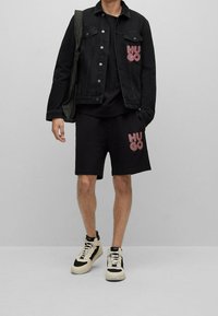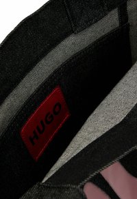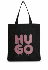 Personne portant une veste en denim noire avec un grand sac fourre-tout noir affichant un texte audacieux "HUGO" en style graffiti rose vif.