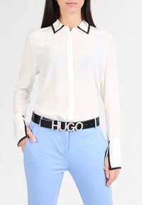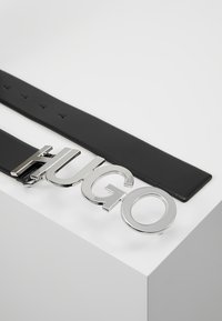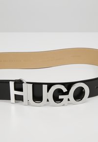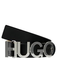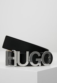 Ceinture en cuir noir enroulée sur une surface blanche avec une grande boucle argentée indiquant "HUGO" en lettres épaisses.