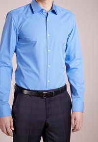 Homme portant une chemise bleu clair ajustée à boutons, une ceinture noire et un pantalon de costume foncé à motifs sur un fond uni.