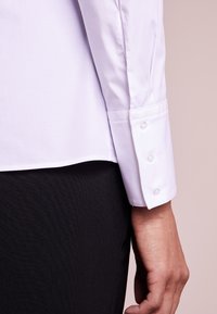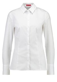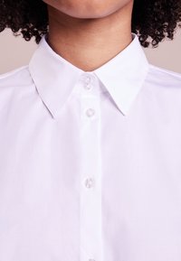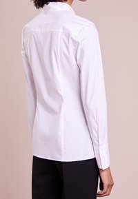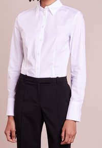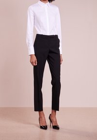 Personne portant une chemise blanche à manches longues ajustée, boutonnée et rentrée dans un pantalon noir taille haute et cintré, debout devant un fond uni.