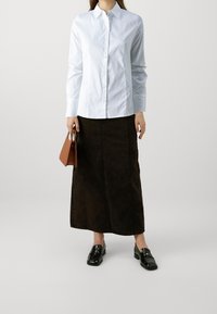 Femme portant une chemise blanche cintrée à manches longues boutonnée, associée à une jupe marron foncé taille haute sur un fond uni.