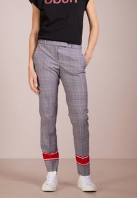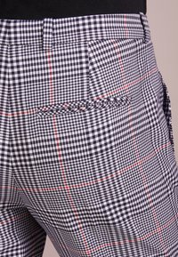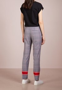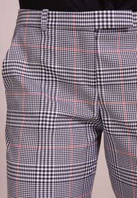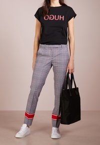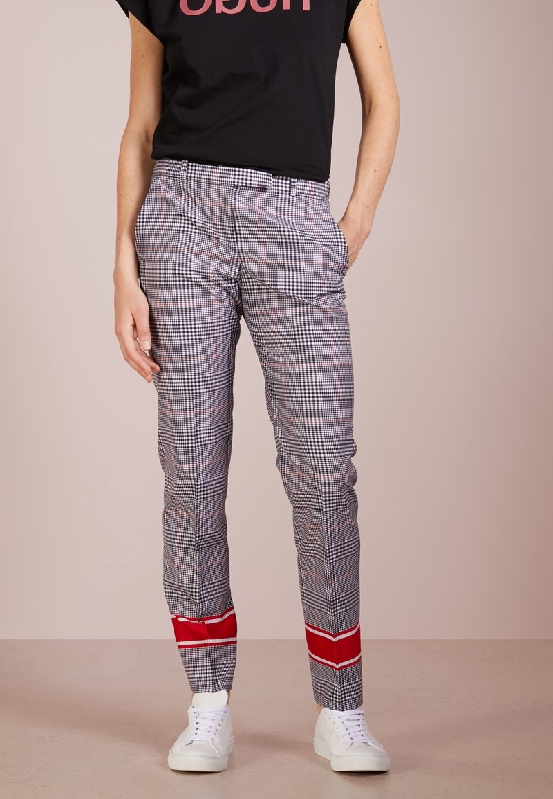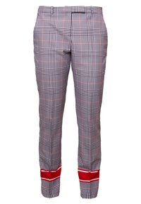 Personne portant un t-shirt noir, un pantalon gris à carreaux avec des rayures rouges près des chevilles, et des baskets blanches debout sur un sol beige.