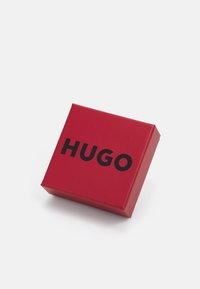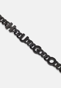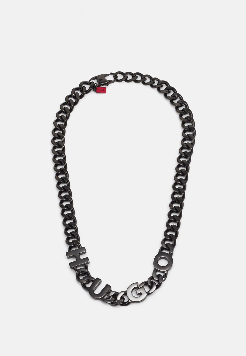 Collier chaîne en métal noir avec de grands maillons et des lettres formant le mot "HUGO" à l'avant, avec une étiquette rouge près du fermoir.