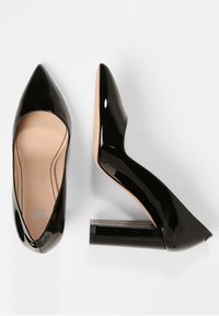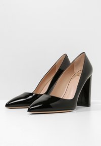 Escarpins en cuir verni noir avec un bout arrondi et un talon bloc. Les chaussures présentent une finition lisse et brillante ainsi qu'une silhouette épurée.