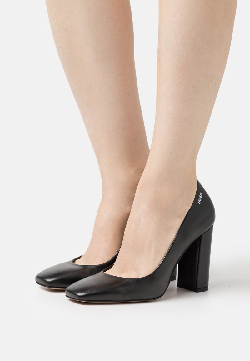 Chaussures à talons hauts en cuir noir avec un bout carré et un talon épais. Branding subtil sur le talon et texture lisse et polie.