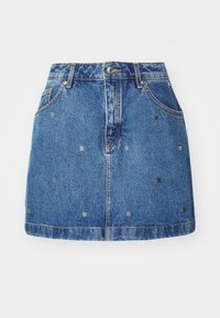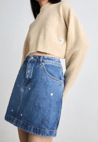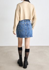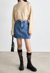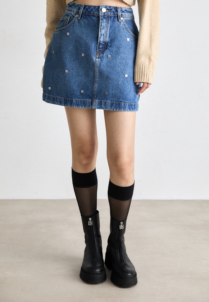 Personne portant une mini-jupe en jean bleu avec de petits motifs de logo blancs, des chaussettes résille noires montant jusqu'aux genoux et des bottes noires épaisses à fermeture éclair.