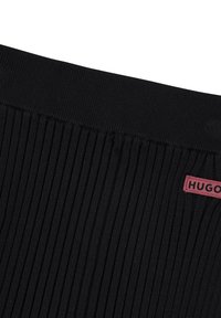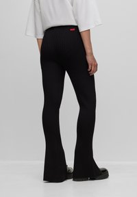 Leggings évasés côtelés noirs avec une taille haute, présentant une petite étiquette de marque rouge à l'arrière et une texture lisse et extensible.