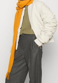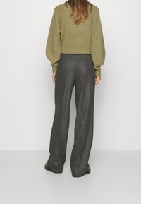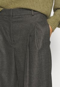 Pantalons larges en tissu gris foncé, dotés de plis, d'une coupe ajustée et d'une texture subtile. Associés à des bottes à semelle épaisse bordeaux.