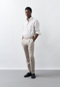 Homme portant un pantalon beige sur-mesure avec plis, une chemise rayée, des mocassins noirs et un bracelet en argent, debout avec une main dans la poche.