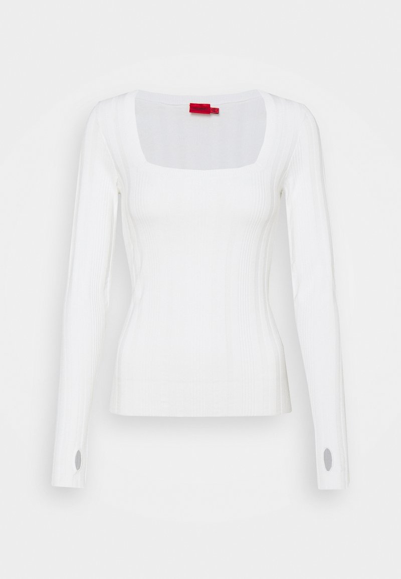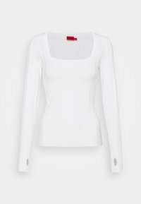 Haut blanc à manches longues ajusté avec encolure carrée et trous pour les pouces aux poignets, présenté sur un fond uni.