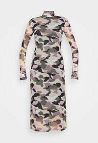 Robe à manches longues avec motif camouflage en nuances de rose, vert et marron, confectionnée en tissu transparent. Présente un col haut et une coupe ajustée.