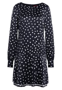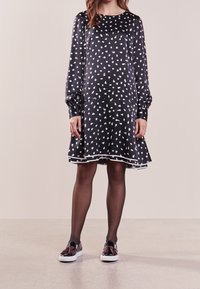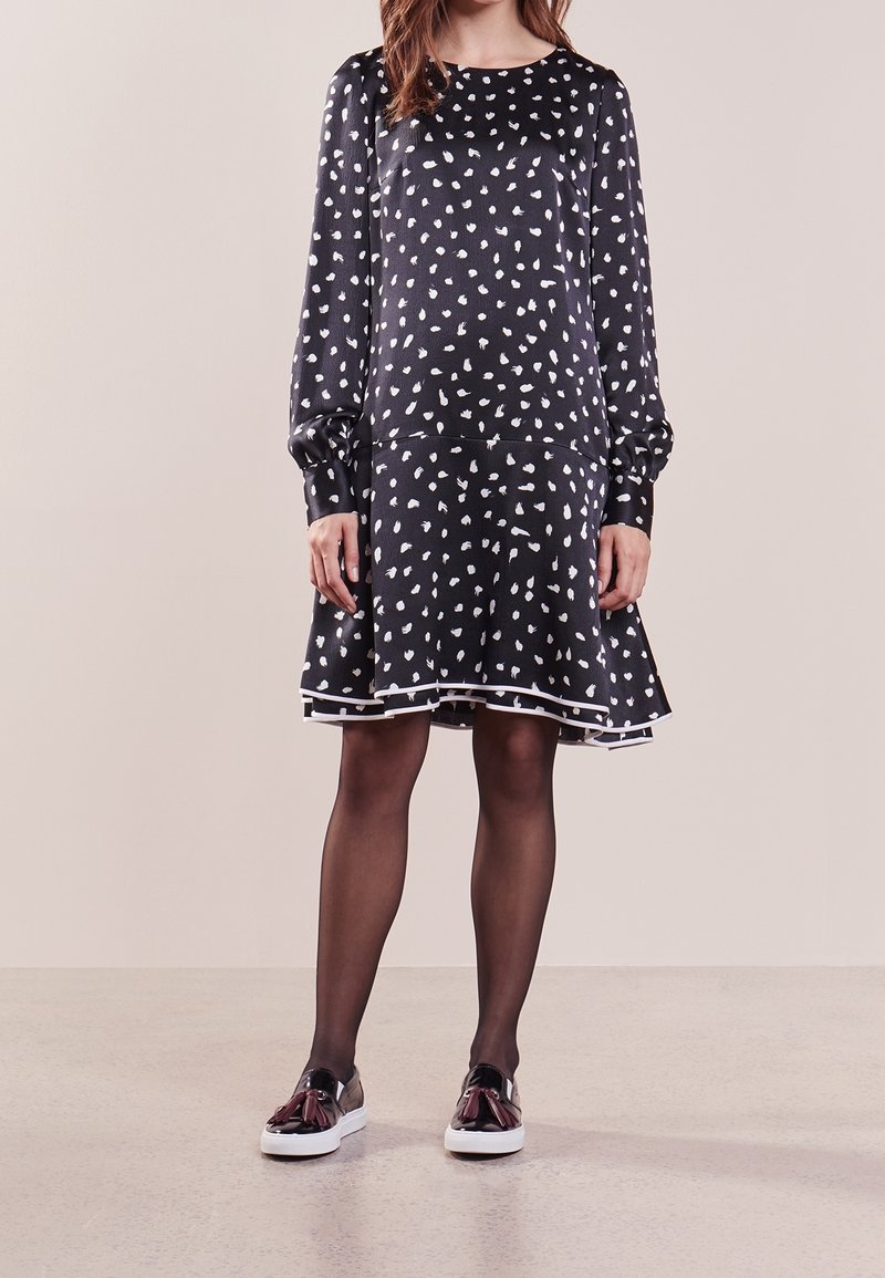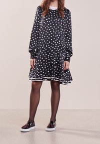 Femme portant une robe noire à manches longues avec des pois blancs, des collants noirs transparents et des chaussures noires à enfiler avec des pampilles décoratives.