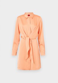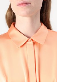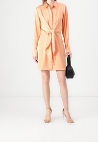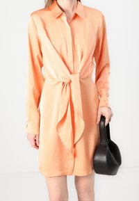 Femme portant une robe en satin pêche à manches longues avec un nœud sur le devant, debout devant un fond blanc uni.