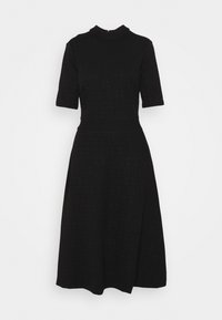 Robe noire midi à manches courtes, col haut, en tissu texturé et avec une taille cintrée. Associée à des bottes en cuir noires jusqu'aux genoux.
