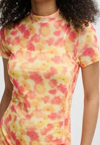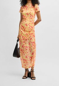Robe fluide à imprimé floral avec un dégradé de teintes jaunes et orangées, manches courtes, et texture froncée sur le côté. Sandales à talons noires.