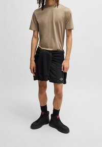Homme portant un t-shirt beige, un short noir avec un logo sur la jambe gauche, des chaussettes noires mi-mollet et des baskets montantes noires avec des accents rouges.
